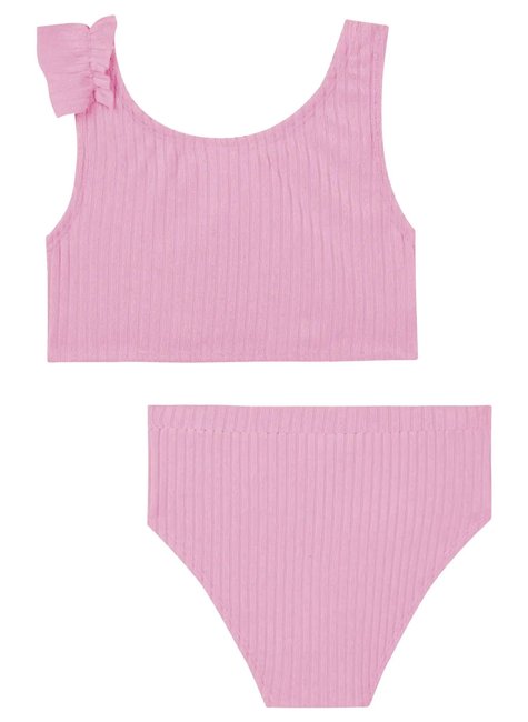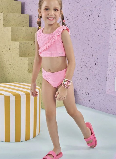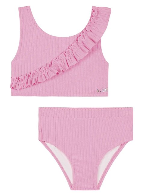 O biquíni em malha atoalhada, prepara as meninas para o verão com muito estilo e conforto! Disponível em uma cor super estilosa - rosa - este biquíni é perfeito para os dias quentes e cheios de aventura. O babado franzido, adiciona um charme especial à peça.