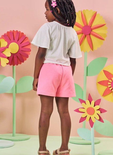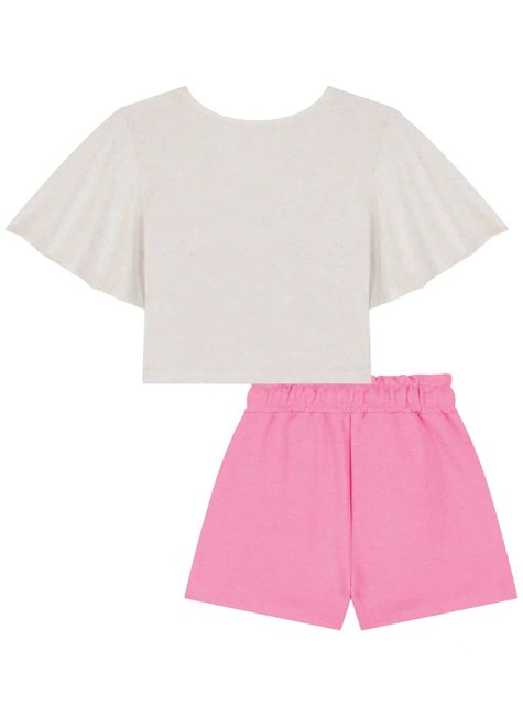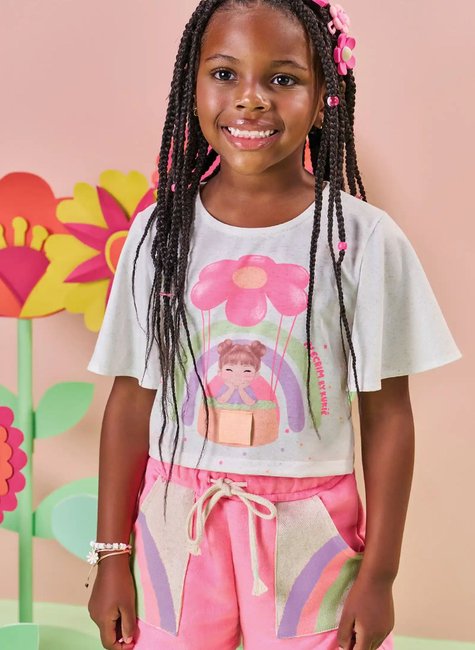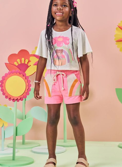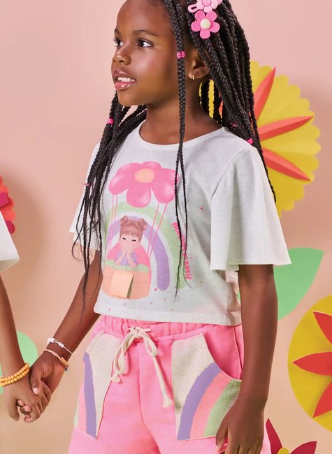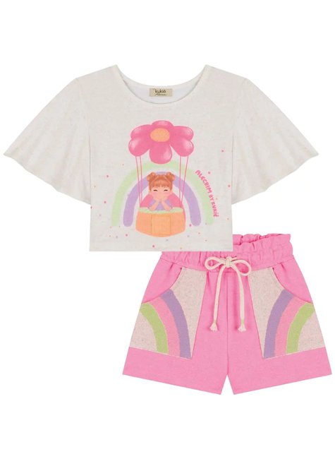 Para um look vibrante e cheio de alegria, o Conjunto Kukie Alegrim é perfeito. A blusa boxy em malha fresh off-white apresenta uma estampa de uma menina em um balão de ar quente colorido, com arco-íris e flores, além de um aplique interativo de um gatinho. O shorts em moletom sem pelúcia neon rosa possui recortes em arco-íris nas laterais e cinto ajustável, ideal para a diversão das meninas.