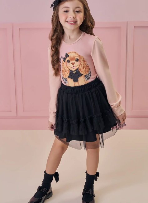 O conjunto infantil Kukiê é a escolha perfeita para meninas que amam um visual delicado, moderno e confortável. Composto por blusa de manga longa e saia em tule com shorts embutido, o modelo traz uma estampa exclusiva de cachorrinha fashion, com laço e detalhes sofisticados, garantindo charme e estilo em qualquer ocasião.
