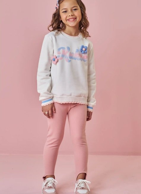 O modelo apresenta estampa frontal delicada com o nome da marca em efeito degradê, acompanhada de aplicações de flores em alto-relevo, que agregam charme e sofisticação à peça. Os punhos e a barra possuem acabamento em ribana com detalhe delicado, garantindo melhor ajuste ao corpo e maior durabilidade.