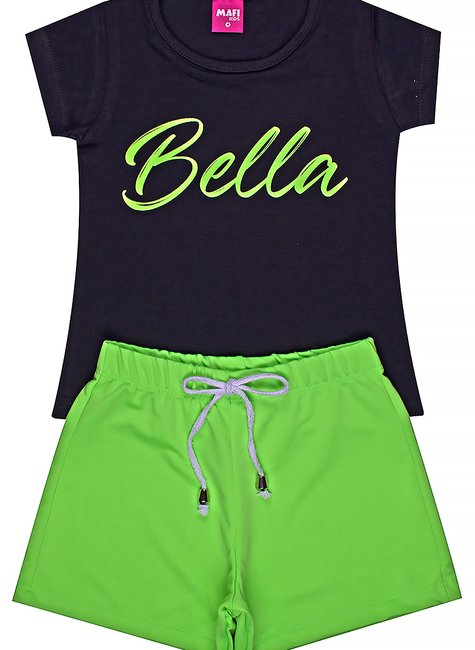 Este conjunto moderno e cheio de estilo é composto por uma camiseta e um short, ideal para meninas que gostam de um visual descolado. A camiseta preta possui a palavra "Bella" estampada em letras grandes e vibrantes em cor verde neon, que traz um destaque especial à peça, adicionando um toque de personalidade e atitude.