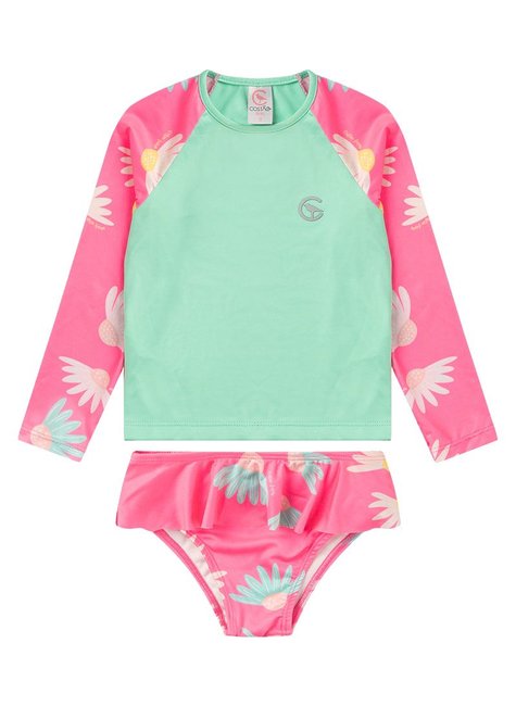 Proteção UV50+: Feito com tecido de alta tecnologia que bloqueia até 98% dos raios UV, o conjunto garante a máxima proteção para a pele sensível das pequenas durante brincadeiras e atividades ao ar livre.