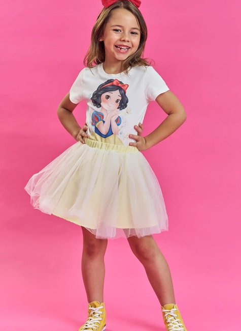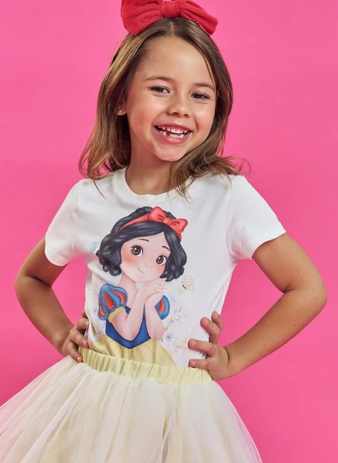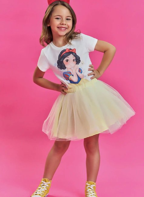 O Conjunto Infantil Kukie Branca de Neve é um verdadeiro conto de fadas transformado em look. Inspirado na princesa mais clássica da Disney, o conjunto traz uma camiseta delicada com estampa exclusiva da personagem, em tons suaves e traços encantadores, combinada com uma saia amarela de tule, leve, rodada e cheia de charme.