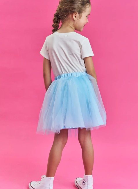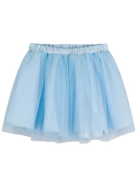 Saia de tule azul clara, rodada e delicada