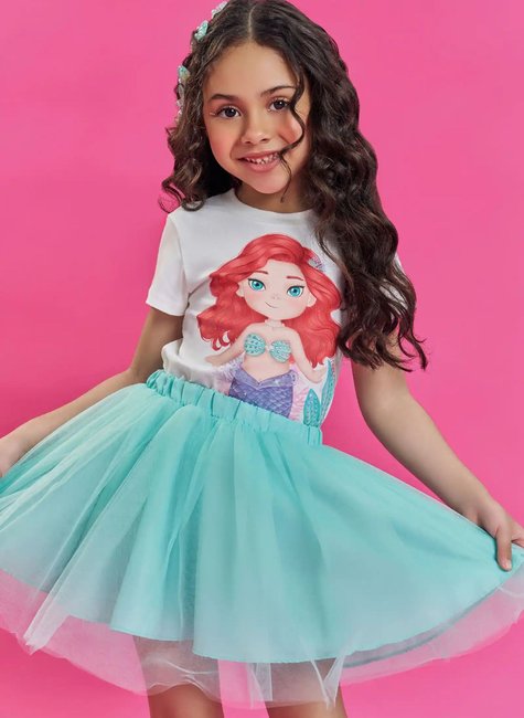 O Conjunto Infantil Kukie Ariel é pura magia do fundo do mar! Inspirado na sereia mais querida da Disney, o conjunto traz uma camiseta charmosa com estampa exclusiva da personagem e aplicação delicada, combinada com uma saia de tule leve e rodada que garante movimento e encanto em cada passo.