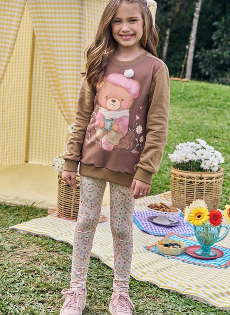 A blusa em moletom possui estampa frontal exclusiva de ursinho Kukie, com aplicação em relevo que traz charme extra à peça. As mangas longas e o acabamento nos punhos garantem conforto e ótimo caimento. A calça legging estampada completa o look com harmonia, oferecendo liberdade de movimentos e muito estilo.