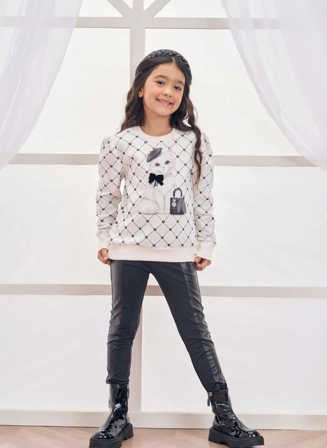 Para as meninas que amam moda com um toque de elegância, este conjunto Infanti é a escolha perfeita! A blusa off-white traz estampa delicada com uma charmosa gatinha em 3D, com aplicação de laço de veludo e mini boina — um verdadeiro show de estilo. O fundo xadrez romântico em preto garante um visual moderno e refinado. A calça skinny em material que simula couro completa o look com atitude e sofisticação, perfeita para os dias mais estilosos do inverno.