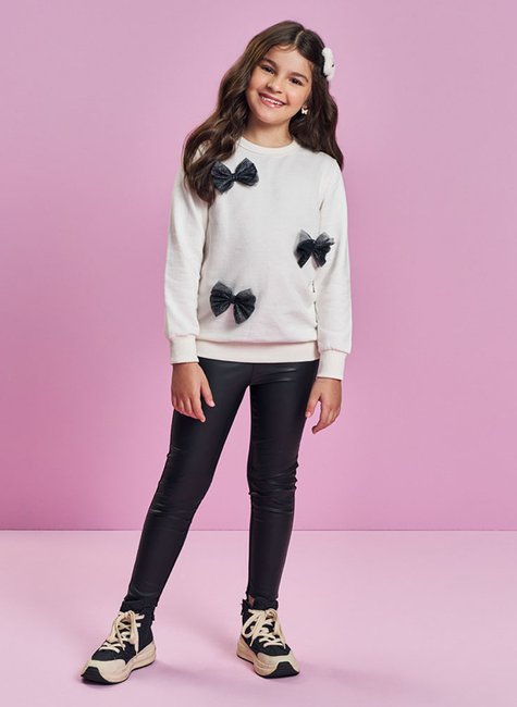 O conjunto infantil feminino Cinti é perfeito para meninas que amam um look estiloso e confortável. Composto por blusão de manga longa com aplicação de laços e legging em cirrê, esse conjunto traz um visual moderno e cheio de personalidade.