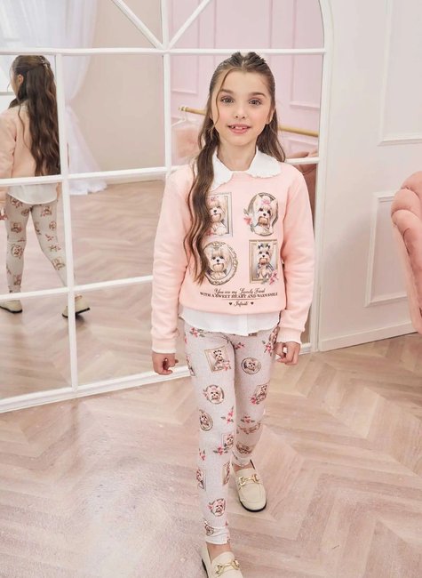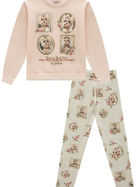 Um look encantador para as meninas que amam conforto e fofura! Esse conjunto da marca Infanti é composto por uma blusa de moletom peluciado em tom rosa claro, com estampa exclusiva de cachorrinhos emoldurados em estilo retrato, trazendo uma proposta lúdica e super charmosa. A frase delicada na barra completa o visual com um toque de doçura.