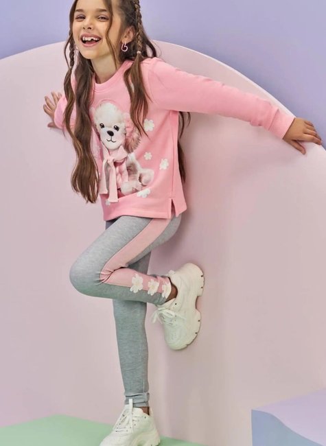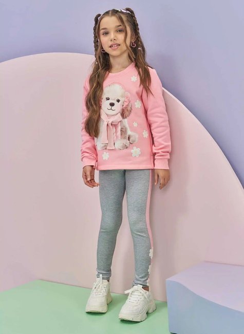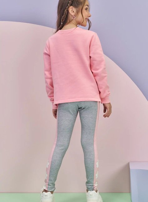 A calça legging, em tom mescla cinza com faixa lateral rosa, é feita em tecido macio e elástico, oferecendo liberdade para brincar. O detalhe das flores aplicadas próximas à barra completa o visual com delicadeza e harmonia com o blusão.