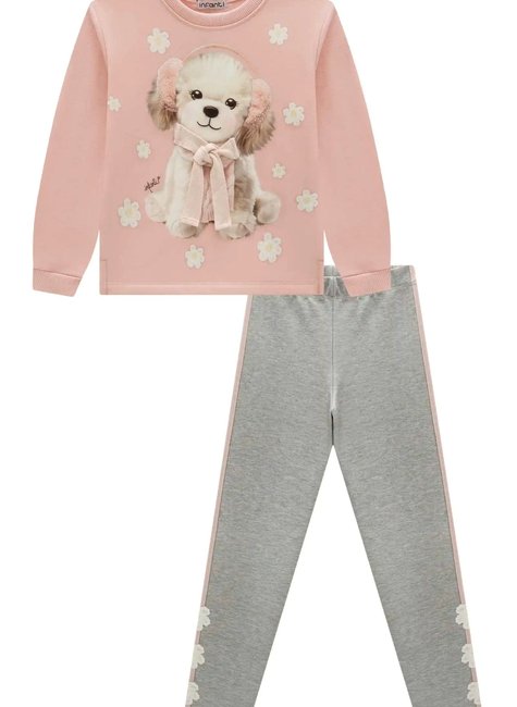 Conforto, fofura e estilo definem esse conjunto da Infanti, perfeito para os dias mais fresquinhos! O blusão em moletom rosa é puro charme, com estampa de cachorrinha superfofa em relevo, que conta com detalhes em pelúcia nas orelhinhas e cachecol, além de pequenas flores aplicadas que trazem um toque lúdico e delicado.