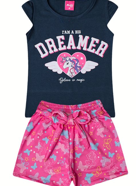 Este conjunto encantador é composto por uma blusa e um short, perfeito para meninas que adoram sonhar e se divertir. A blusa azul-marinho traz a frase "I'm a Big Dreamer" em destaque, acompanhada por uma estampa de unicórnio em um coração alado, com a mensagem "Believe in Magic" logo abaixo. Uma estampa inspirada no espírito de aventura e fantasia, ideal para meninas criativas.