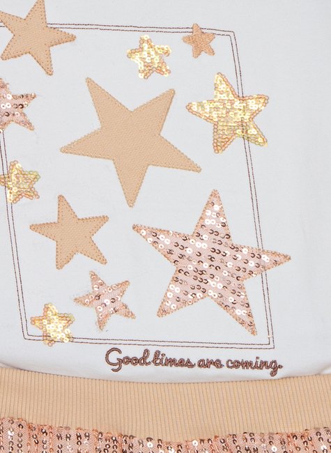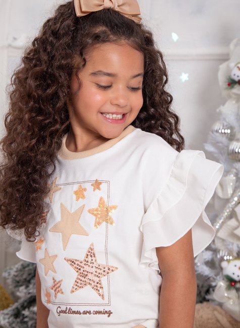 A blusa em malha macia traz estampa exclusiva com estrelas em paetê e babadinhos nas mangas, deixando o look delicado e cheio de charme.