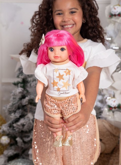 E tem um detalhe especial: o conjunto vem com a roupinha da boneca combinando com o look da menina – porque brincar de se vestir igual é muito mais divertido.