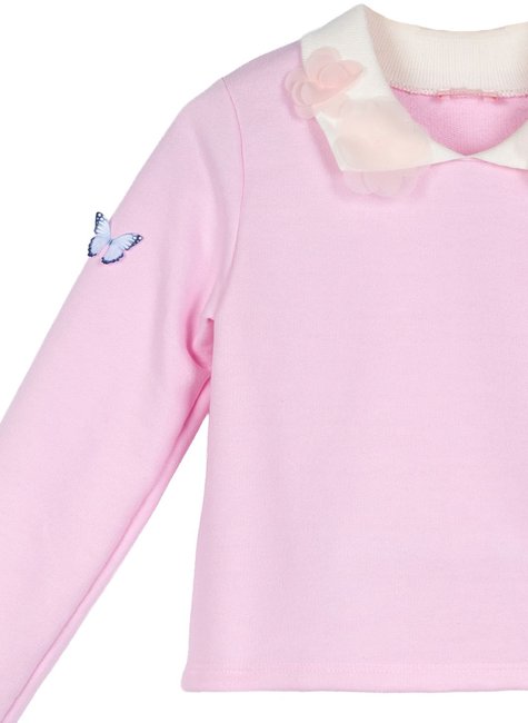 👚 Casaco: Confeccionada em moletom sem felpa, ideal para dias de meia-estação. A gola em retilínea traz flores aplicadas com acabamento delicado, enquanto as borboletas 3D nas mangas dão o toque mágico que encanta. Modelagem confortável sem punho na barra ideal para usar com o macacão.