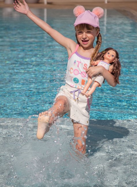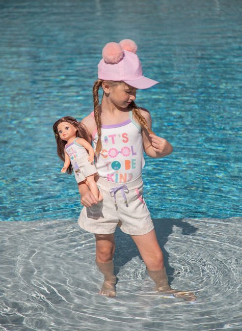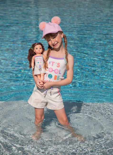 Look combinando com a boneca: a criança e a boneca usam o mesmo estilo, deixando tudo mais divertido!