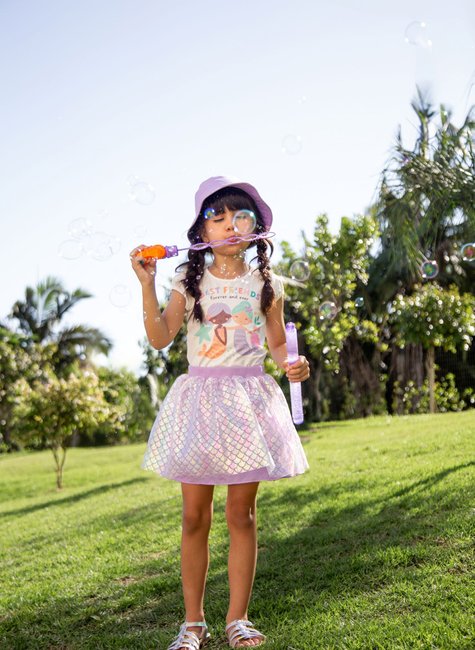 Saia com shorts embutido para mais segurança e conforto ao brincar.
