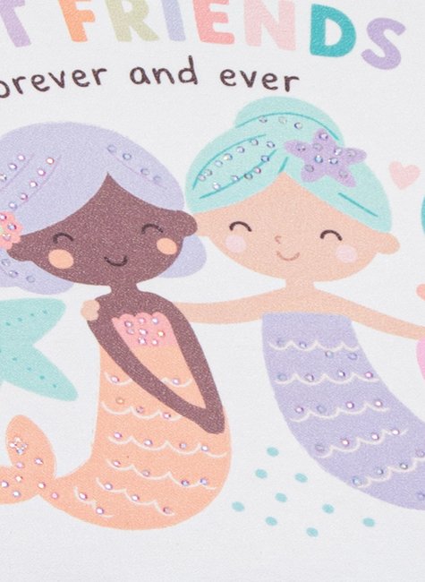 Blusa super delicada, com estampa BEST FRIENDS com sereias e detalhes coloridos.