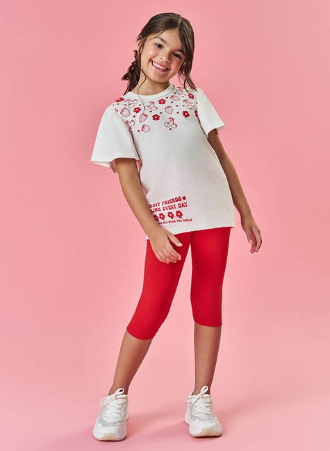 Conjunto perfeito para as pequenas que adoram conforto e estilo! A blusa em meia malha apresenta cava deslocada, com franzido nas mangas e uma estampa frontal com cheirinho de morango, complementada por strass que trazem um brilho especial!