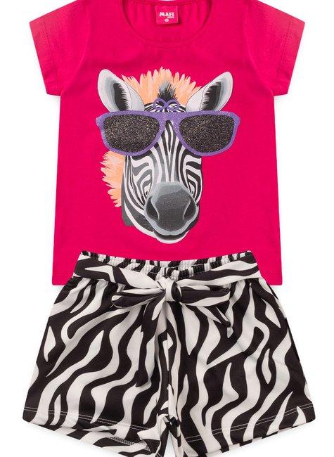 Blusa: Confeccionada em tecido macio, com uma estampa superdivertida de uma zebra estilosa usando óculos de sol com glitter, em um fundo rosa vibrante. A manga curta e o design moderno garantem conforto e leveza.