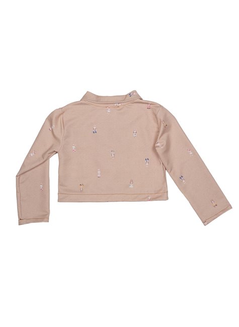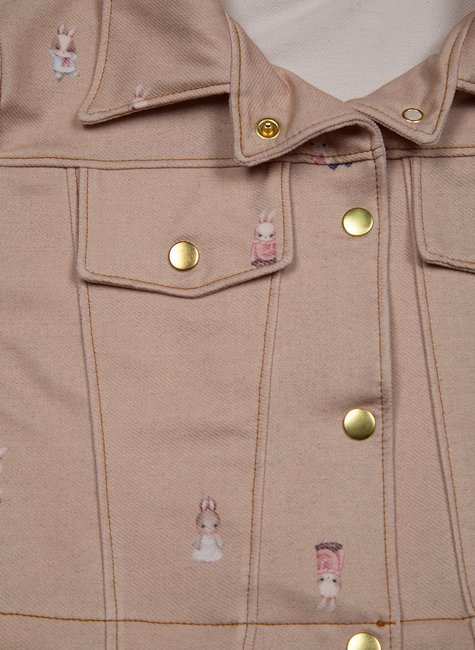 Estampa: Pequenas ilustrações de coelhinhas em diferentes poses e roupinhas espalhadas pelo tecido, dando um ar lúdico e delicado à peça.
