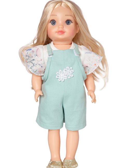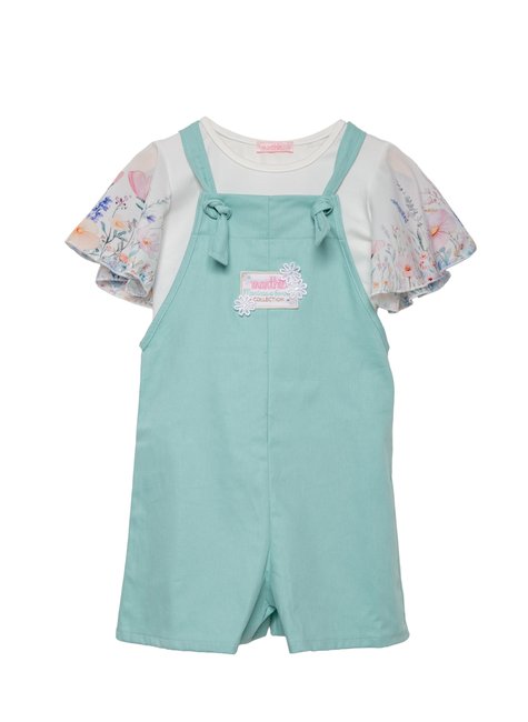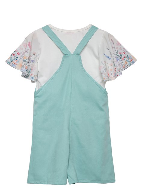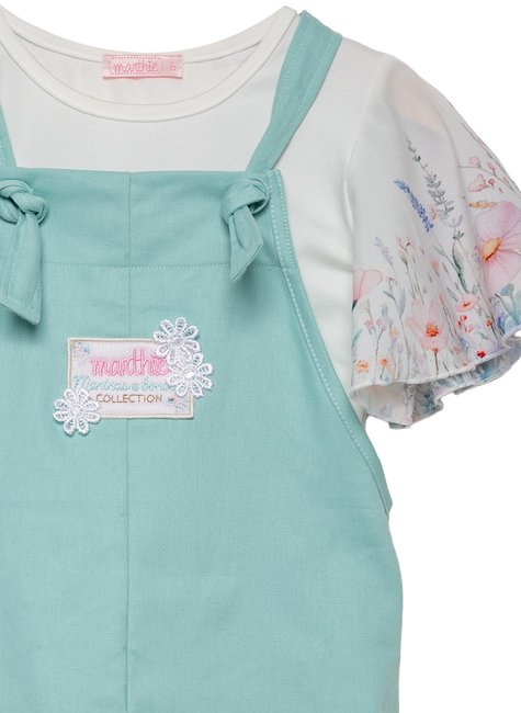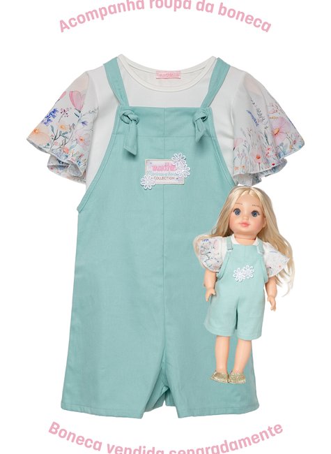 Jardineira em Sarja com Blusa Flower- Menina e Boneca