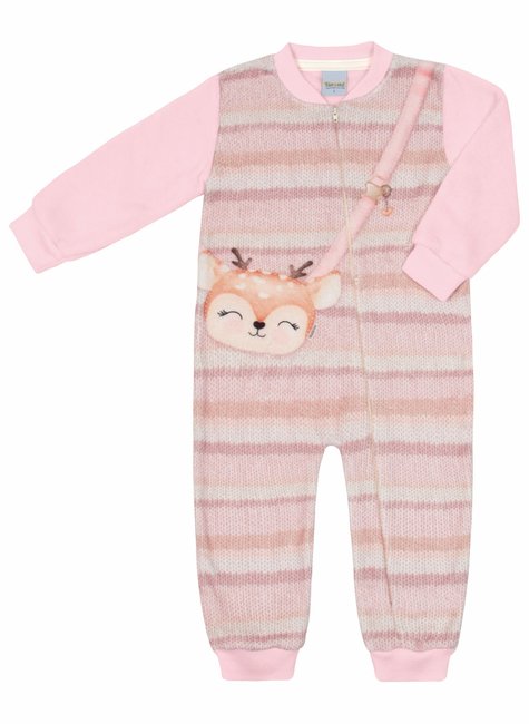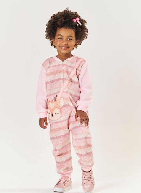 Na cor rosa claro, suave e delicada, o macacão traz como destaque uma charmosa estampa de alce na parte frontal, que dá um toque lúdico e divertido à peça – ideal para crianças que adoram animais e personagens encantados.
