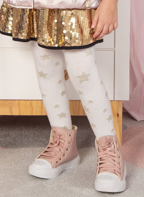 Desenvolvida em tom creme com as estrelas no tom areia, ela combina facilmente com o guarda-roupa das meninas. Esta meia é ideal para composições criativas ou até mesmo com aquele look liso, dando um aspecto lúdico e infantil.