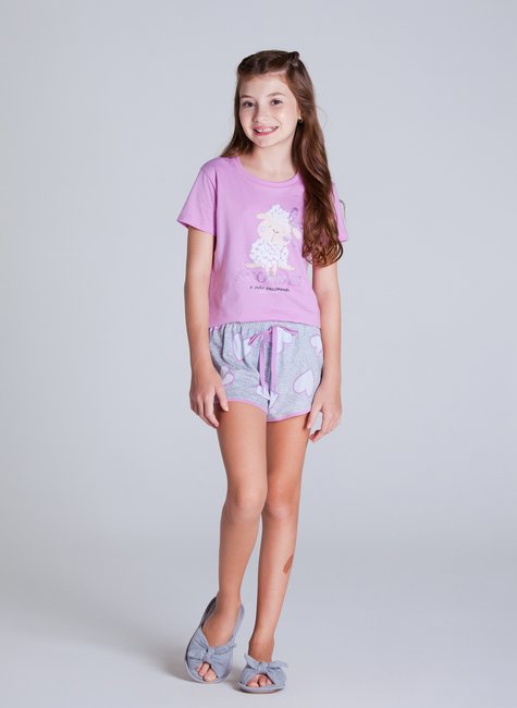 Este é um Pijama produzido em Meia Malha, composto por uma Blusa manga curta na cor lilás, com estampa frontal de ovelhinha. Composto também por um Short com estampa de corações, elástico de 2cm e cadarço decorativo.