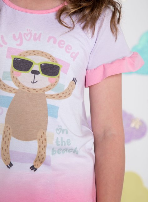 Este pijama infantil acompanha um conjunto adicional idêntico para a boneca, permitindo que a criança e sua boneca favorita combinem o visual de forma charmosa. O conjunto traz a mesma camiseta com estampa de bicho-preguiça e o short rosa, proporcionando momentos de diversão e conexão durante a brincadeira!