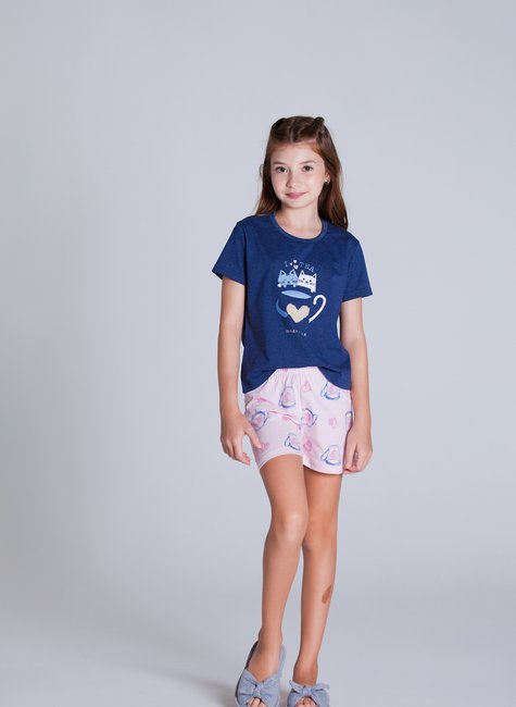 Este é um Pijama produzido em Meia Malha, composto por uma Blusa manga curta na cor azul mesclado, com estampa frontal de xícara de gatos e aplique em pelo. Composto também por um Short na cor rosa com estampa de xícaras e elástico de 2cm.