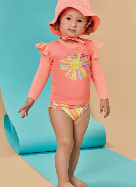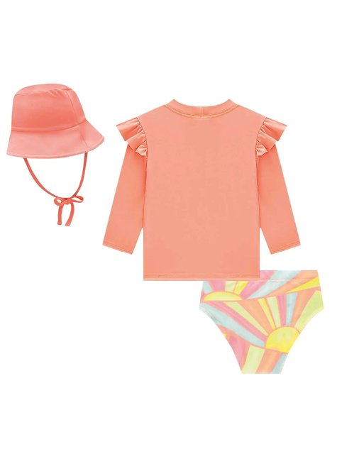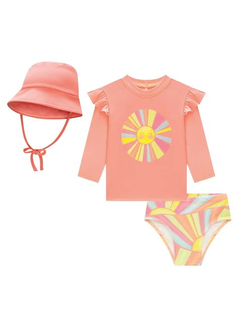O conjunto de blusa, calcinha e chapéu em malha UV dry com proteção UV50+ é perfeito para as meninas que amam um look cheio de estilo e conforto para aproveitar muito o verão! Disponível em uma cor super estilosa - laranja - ele oferece um toque super macio e confortável, garantindo proteção para a pele das meninas! A sublimação divertida e o strass, adicionam um charme especial à peça.