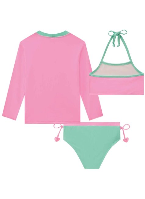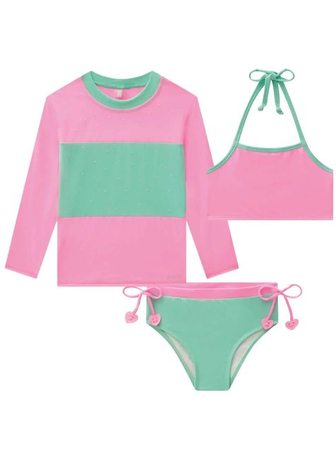 O trio de blusa e biquíni em malha poliamida com proteção UV50+ é perfeito para as meninas que amam um look cheio de estilo e conforto para aproveitar muito o verão! Disponível em uma cor super estilosa - rosa - ele oferece um toque super macio e confortável, garantindo proteção para a pele das meninas! O patch e o strass, adicionam um charme especial à peça