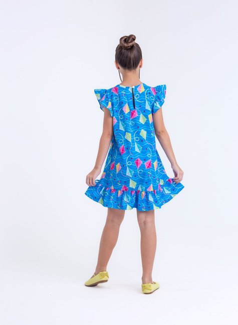 Esse vestido pode ser combinado com sapatilhas, elegantes ou até mesmo tênis, criando um visual versátil e confortável para o dia a dia. A estampa de pipas coloridas contra o fundo azul faz desta peça uma escolha alegre e descontraída, perfeita para meninas que gostam de um look divertido e cheio de energia, inspirado nas brincadeiras ao ar livre!