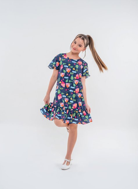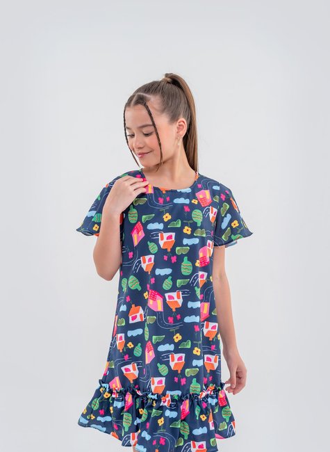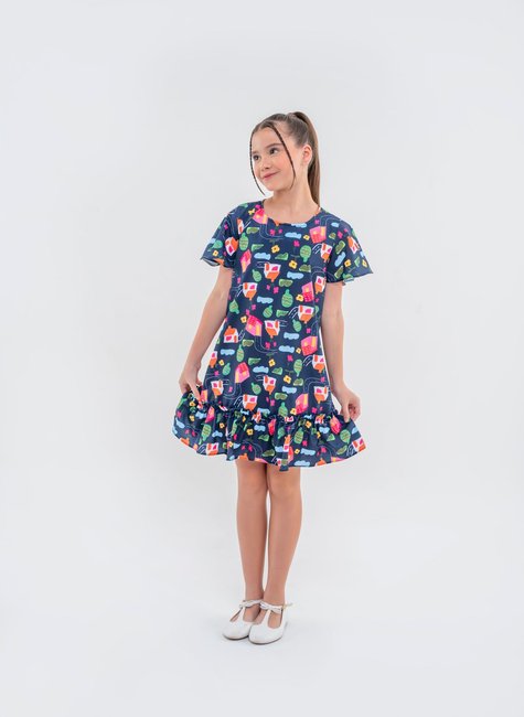 Este vestido é a escolha perfeita para meninas que adoram um visual alegre e despojado! Com uma estampa divertida que traz elementos coloridos como casinhas, árvores e óculos de sol, o fundo azul escuro destaca ainda mais as cores vibrantes, criando um look único e cheio de personalidade. A barra de babado adiciona um toque extra de charme e movimento, tornando o vestido ideal tanto para momentos casuais quanto para festas. Confeccionado em tecido leve, ele oferece conforto e liberdade para brincar e se movimentar à vontade.