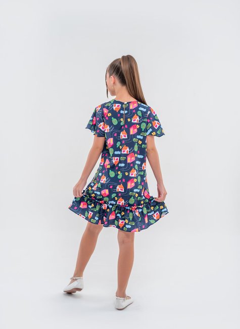 Vestido Estampado Divertido Casinha com Babado na Barra