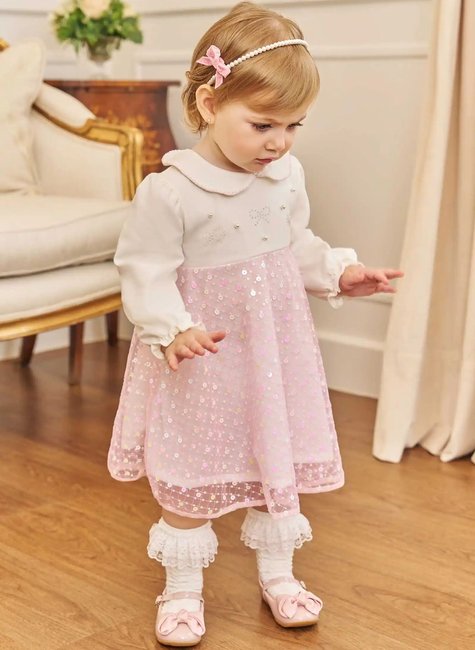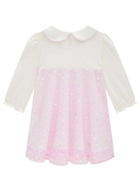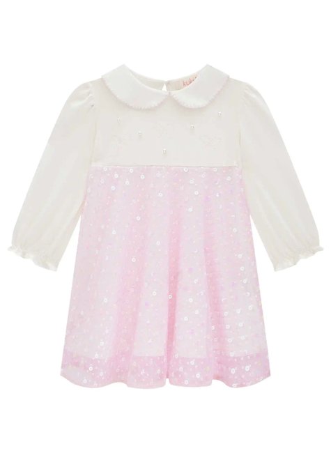 Vestido em cotton e tule bordado Bebê menina Kukiê Esse vestido é uma peça encantadora, perfeita para momentos especiais, oferecendo elegância e conforto para a sua pequena. Confeccionado com uma combinação sofisticada de cotton e tule bordado, o vestido possui um design delicado e romântico, ideal para ocasiões especiais como festas, casamentos, batizados e eventos formais. A parte superior da peça, na cor off-white, apresenta um toque clássico e refinado, complementado pelo detalhe em bordado e a aplicação de pérolas e strass, proporcionando um brilho sutil e sofisticado ao visual. O colarinho arredondado com acabamento delicado adiciona um toque vintage e elegante, enquanto as mangas longas com punhos franzidos oferecem um caimento fluido e confortável. A saia, confeccionada em tule rosa bordado com detalhes brilhantes, cria um efeito encantador, conferindo um visual de princesa que encanta meninas de todas as idades. O forro interno garante um toque suave à pele, permitindo que a criança se movimente com liberdade e conforto ao longo do dia.
