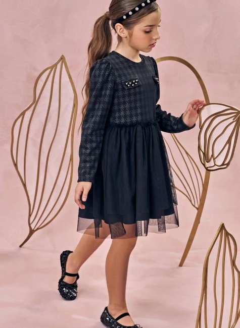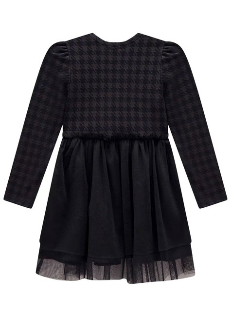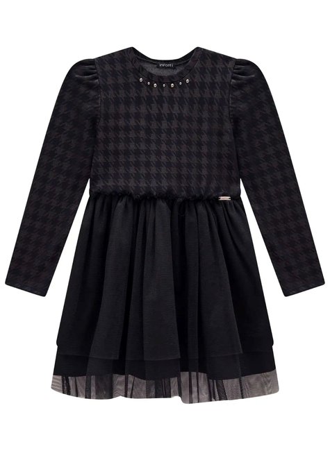 Elegância e delicadeza para ocasiões especiais! Este vestido preto da marca Infanti encanta pelos seus detalhes sofisticados e acabamento impecável. A parte superior traz estampa clássica pied-de-poule com mangas longas e aplicação de botões perolados e brilhos sutis, que deixam o look moderno e refinado.