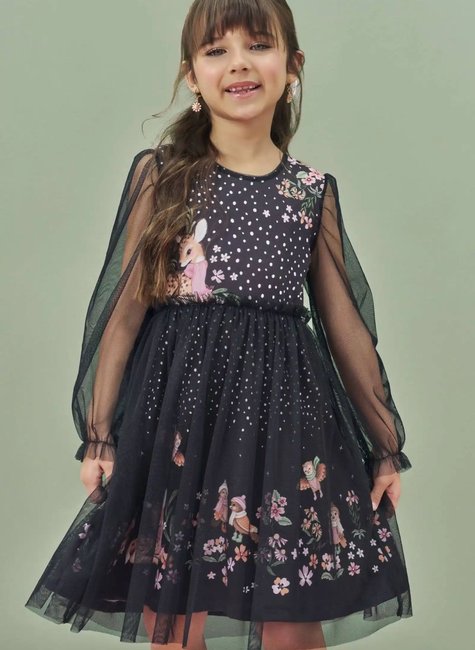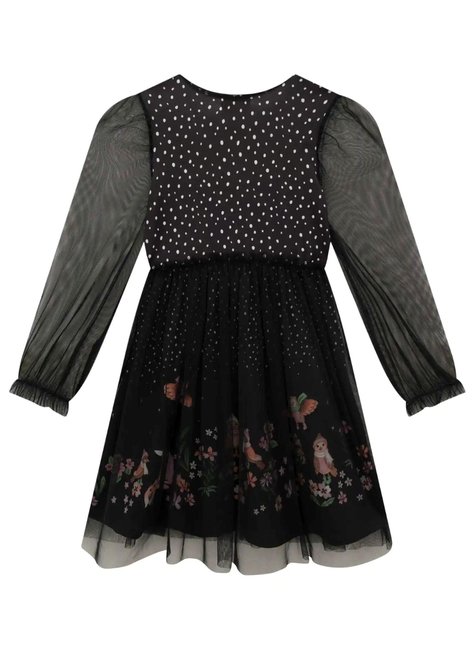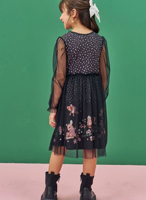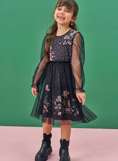 Vestido em malha power e tule Infantil Menina Infanti Nosso lindo vestido em malha power e tule é um verdadeiro encanto, com vários detalhes delicados esse vestido realmente é perfeito para um visual mais romantico. As mangas em tule transparente e o tule na saia deixam a peça com um aspecto leve, temos também uma estampa fofa e delicada que da um toque especial e mágico ao look. Ideal para ocasiões especiais, combine com uma botinha ou sapatilhas.