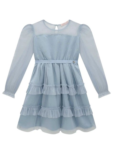O modelo possui mangas longas bufantes, corpo com aplicação de pequenas pedrinhas delicadas e uma charmosa faixa na cintura, que marca a silhueta com elegância. A saia é o destaque: composta por camadas com babados em tule franzido, que criam um visual romântico, leve e encantador.