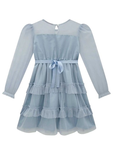 Encantador e sofisticado, esse vestido da marca Kukiê é perfeito para momentos especiais. Em tom azul suave, ele é confeccionado em tule leve e delicado, com um caimento impecável que valoriza a leveza e o movimento.