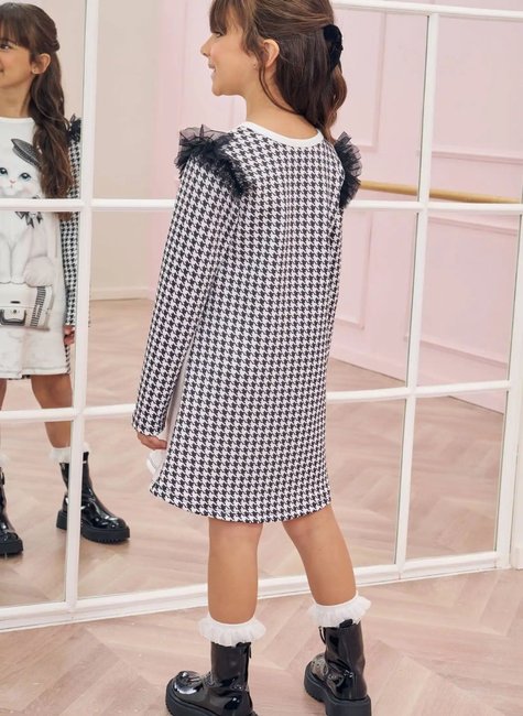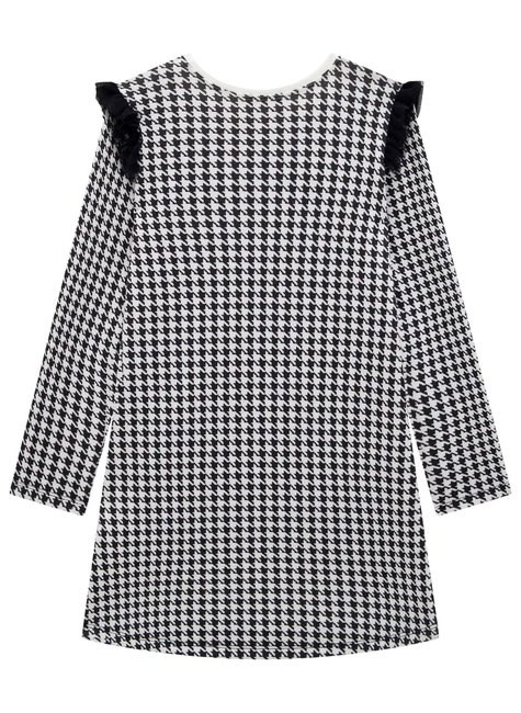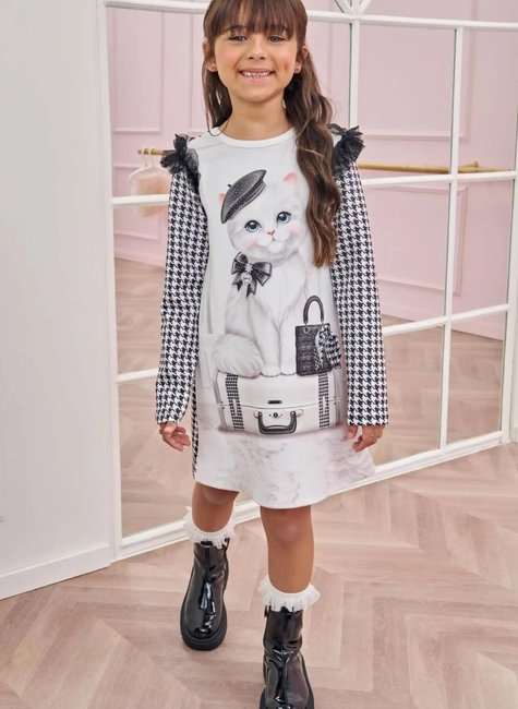 Vestido em Fly Tech Infantil Menina Infanti Charmoso vestido confeccionado em fly tech. Possui delicada estampa frontal de gatinha parisiense em aolique de lenlo em pied poule em sua bolsa. Encantador detalhe de babados em tule nas mangas. Costas e mangas em fly tech estampadas em pied poule, clássica padronagem de inverno. A peça p&B é perfeita para almoços em família e passeios com a dinda no shopping. Aposte em combinações com meia 34 e sapatilhas para um look ainda mais glam!