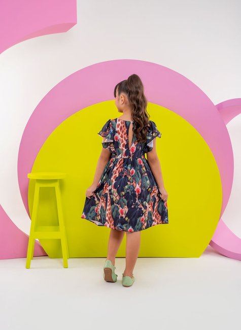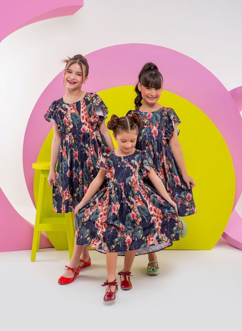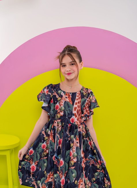 Este encantador vestido infantil é a escolha perfeita para meninas de 2 a 14 anos que adoram um toque de magia na moda. Feito em crepe especial, o vestido combina conforto e estilo com sua fluidez e caimento soltinho, permitindo liberdade de movimento para as pequenas. A estampa vibrante de floresta e girafas traz um ar lúdico e aventureiro, tornando cada dia uma nova descoberta.