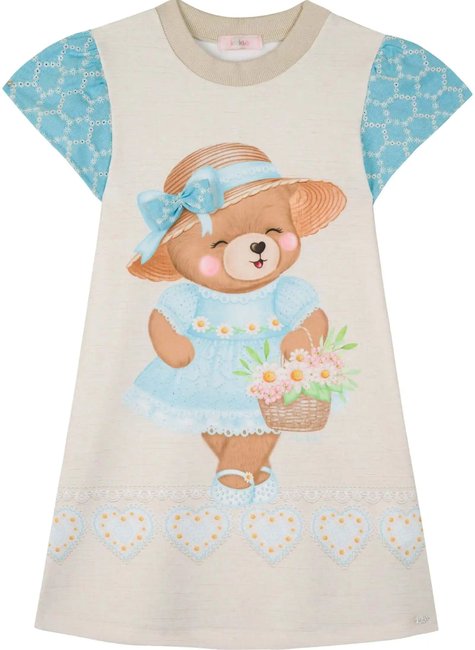 A peça traz estampa exclusiva da marca, com uma ursinha sorridente vestida de azul, chapéu com laço e cestinha de flores, transmitindo encanto e doçura. As mangas curtas em tom azul possuem detalhes discretos que deixam o visual ainda mais sofisticado.