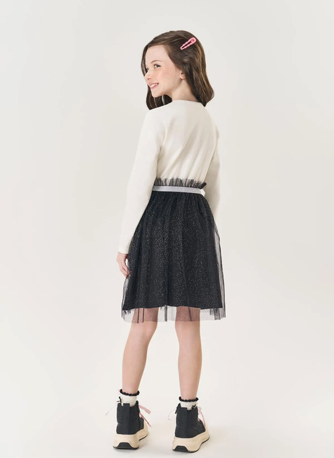 O elástico prata na cintura cria um ajuste confortável e elegante, enquanto a rebarba da saia em tule iris galaxy confere volume e um efeito encantador, com um toque de brilho. A etiqueta decorativa próxima da bainha adiciona um detalhe de charme extra. Ideal para compor looks sofisticados e cheios de personalidade para a sua pequena brilhar!
