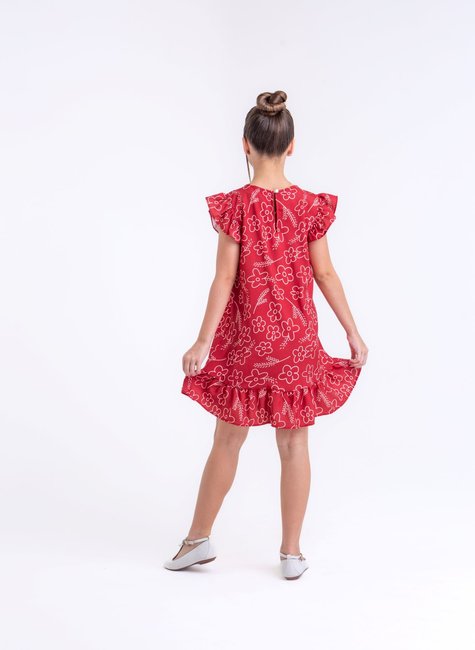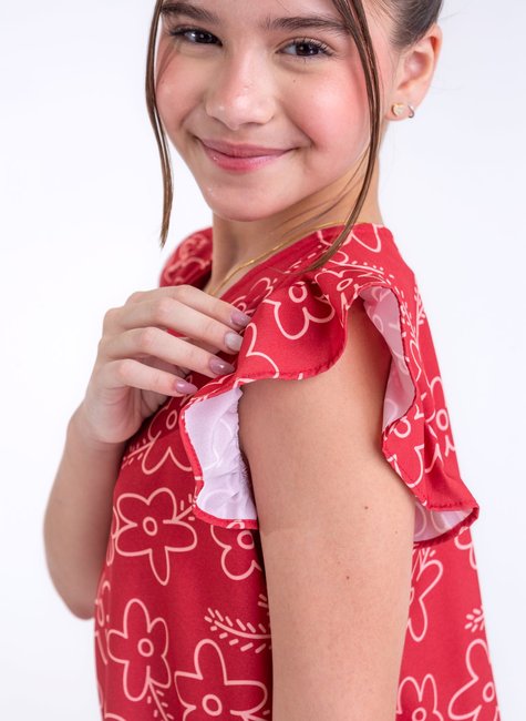 A modelagem do vestido é reta, proporcionando um caimento confortável e fluido que permite liberdade de movimento, ideal para crianças que gostam de brincar e se movimentar com facilidade. A barra do vestido é adornada com um babado charmoso, que adiciona um toque romântico e um pouco de volume à peça, dando ainda mais graciosidade ao look. As mangas curtas com babados nos ombros trazem um ar de leveza e delicadeza, formando um efeito "asa" que complementa o visual floral de maneira harmoniosa.