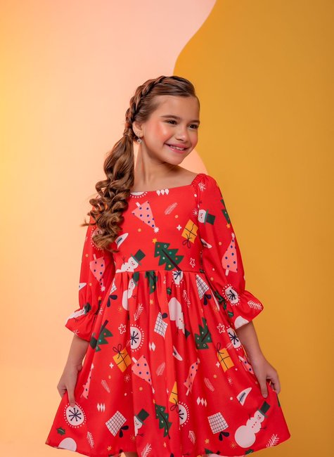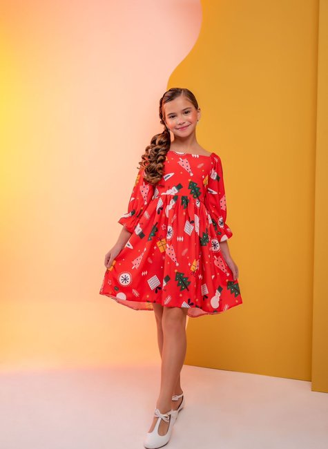 Com o Vestido de Manga 3/4 Vermelho com Estampa de Natal, sua pequena vai encantar a todos e celebrar a temporada com um toque de elegância e alegria. Faça de cada festa de fim de ano um momento inesquecível com esta peça adorável e festiva!