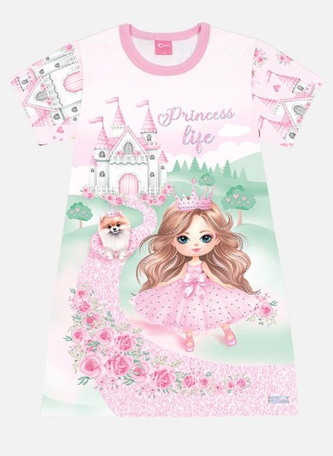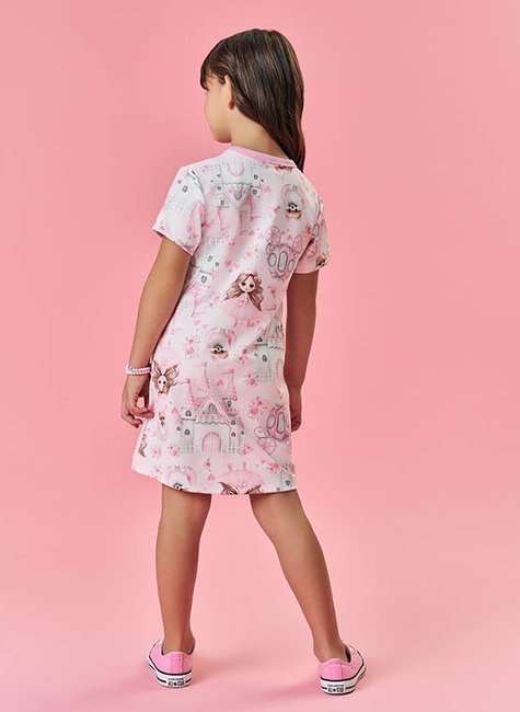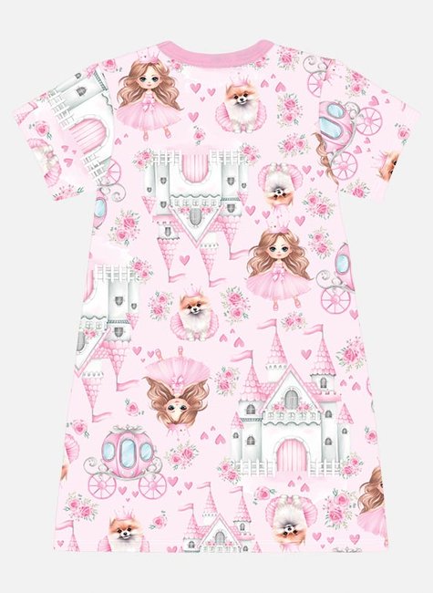 Transforme o dia da sua pequena em um verdadeiro conto de fadas com este vestido infantil encantador, feito para meninas que amam o universo mágico das princesas! Com uma estampa exclusiva de castelo, princesa e pet, o modelo traz um visual lúdico e delicado, ideal para passeios, festas ou momentos especiais.