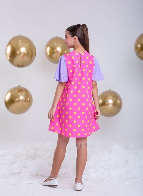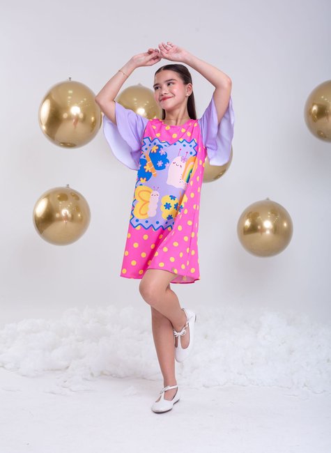 Estampa alegre: Combinando elementos fofos como borboletas, flores e caracóis em um fundo rosa vibrante com bolinhas amarelas, esse vestido é pura diversão.