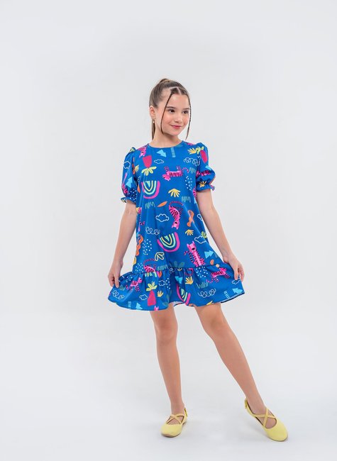 A barra com babados adiciona um toque de movimento e feminilidade ao visual, enquanto o corte fluido proporciona liberdade para brincar e explorar. O tecido leve e confortável garante que sua pequena possa usar o vestido durante todo o dia, seja em passeios ao ar livre, festas ou no dia a dia. A mistura de cores e formas faz deste vestido uma peça única, que equilibra estilo e criatividade de maneira encantadora.